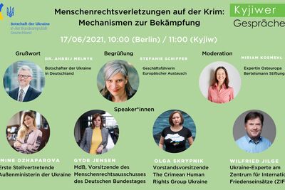 Aktuell befinden sich 111 Personen aufgrund von politischer oder religiöser Verfolgung auf der Krim in Gefängnissen oder in Strafkolonien. Versammlungs-, Vereinigungs- und Meinungsfreiheit sowie die Freiheit der Medien sind eingeschränkt. Was tun angesichts massiver Menschenrechtsverletzungen auf der Krim? Im Rahmen dieser Online-Veranstaltung wurden Strategien besprochen und die Krim-Plattform vorgestellt, eine außenpolitische Initiative der Ukraine in der Krim-Frage.