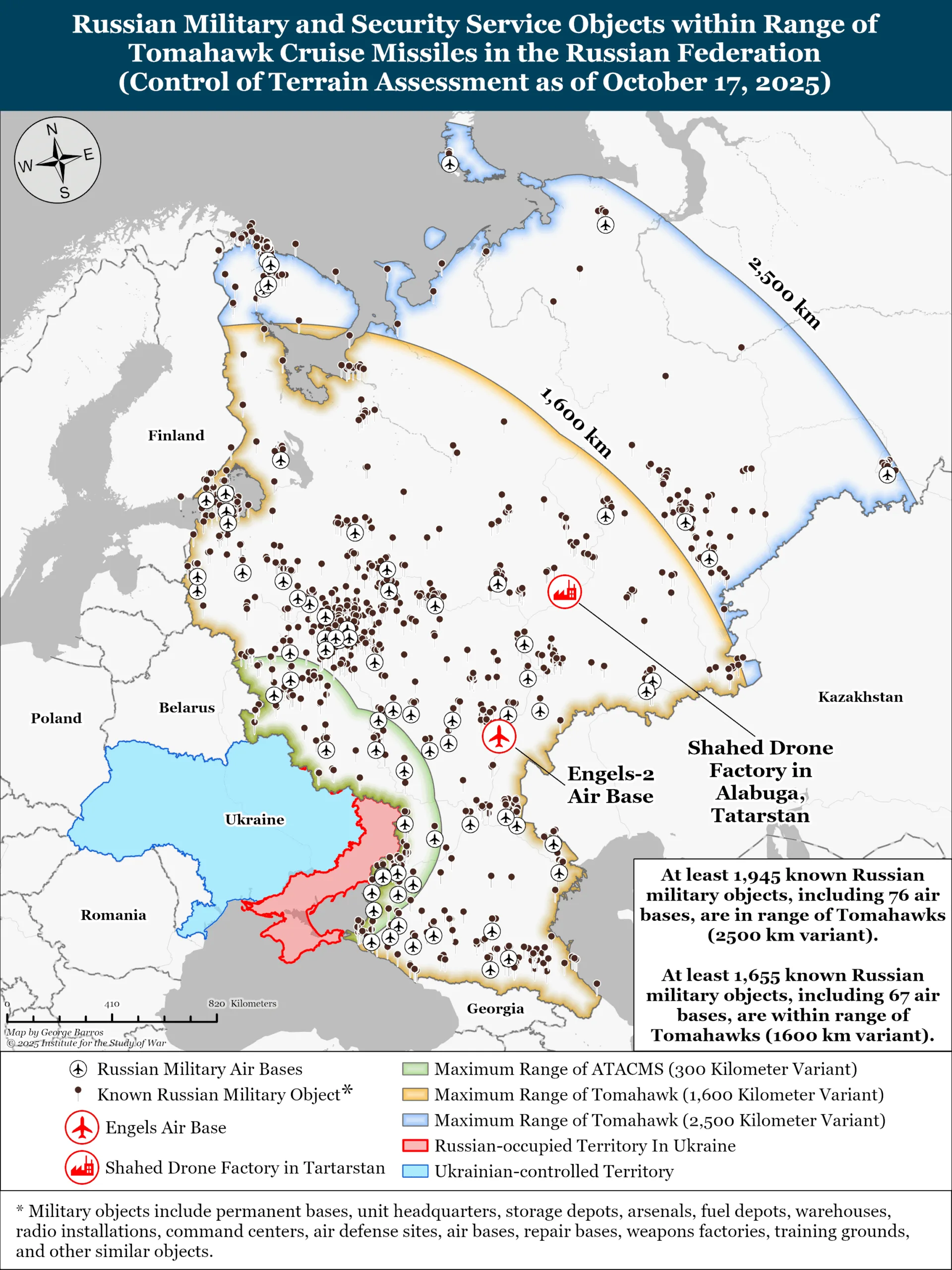 Russische Militär- und Sicherheitseinrichtungen in Reichweite des US-amerikanischen Marschflugkörpers vom Typ Tomahawk, Quelle: ↗ ISW, 17.10.2025.