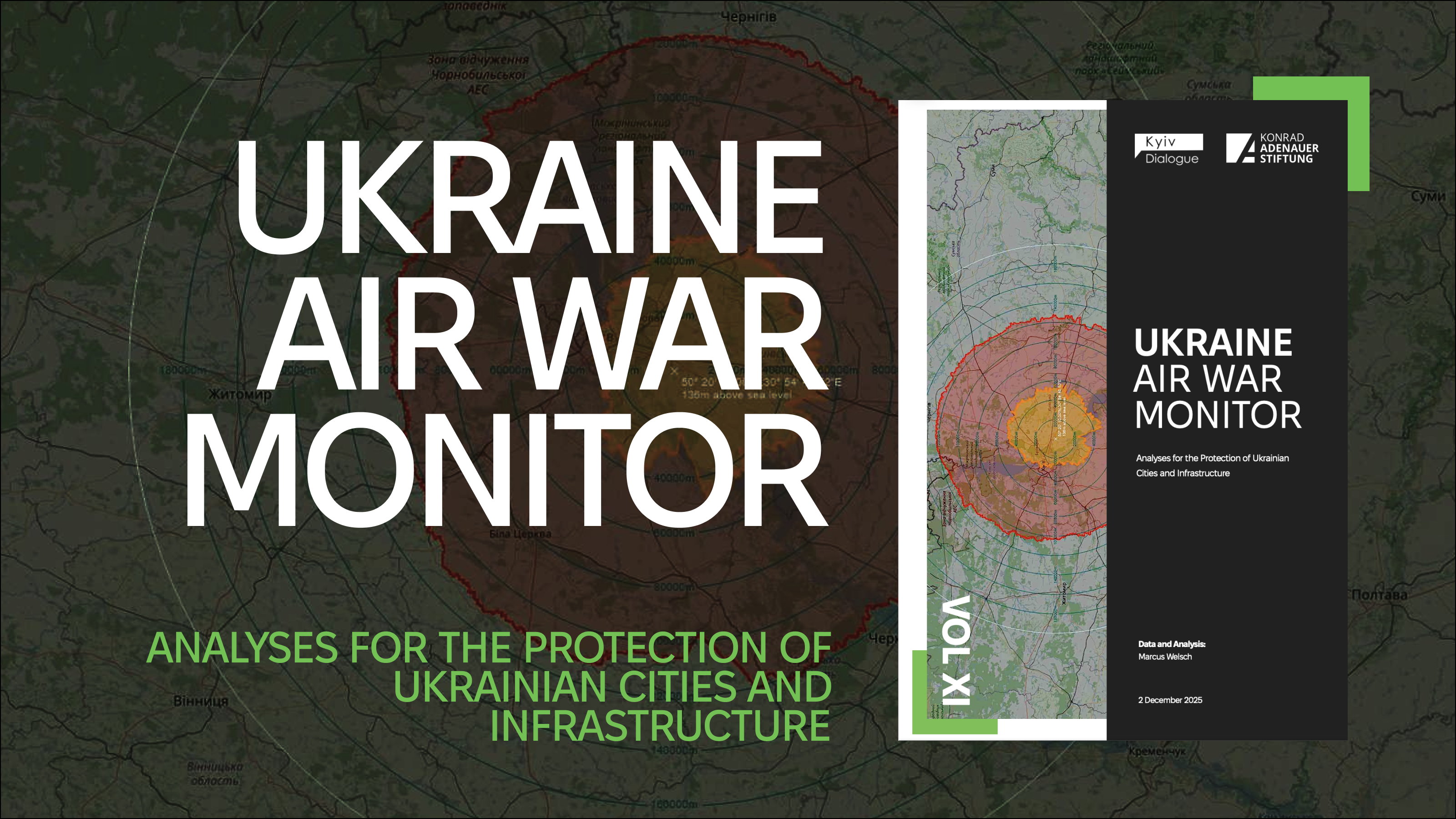 Щомісячний дайджест «Моніторинг повітряної війни проти України» пропонує грунтовні аналізи актуальних хвиль атак і довгострокових тенденцій у російській повітряній війні проти України. Він базується на всеохопній базі даних, що з осені 2022 року фіксує кожен задокументований авіаційний удар по цивільних цілях України. Метою моніторингу є формулювання рекомендацій щодо того, як західні країни-партнери можуть краще підтримати захист України від повітряних атак росії. «Моніторинг повітряної війни проти Україні» видається «Київським діалогом» у співпраці з аналітиком Маркусом Вельшем, який збирає та аналізує інформацію, що є у вільному доступі (метод OSINT), і Фондом Конрада Аденауера.